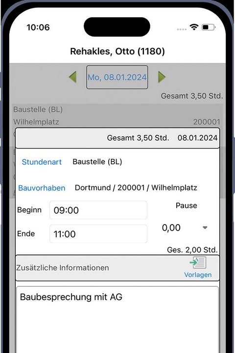 Vorarbeiter sind mit bau-mobil in der Lage, sämtliche, für die Lohnabrechnung relevanten Daten unmittelbar auf den Baustellen zu erfassen. Die Zeiterfassung und die Aufnahme von Maschinen- und Geräteberichten wird um Leistungserfassung und die fotografische Dokumentation von Baufortschritten ergänzt. Dabei ist die Lösung so konzipiert, dass sie sich selbst mit geringen IT-Vorkenntnissen auf einfache Weise bedienen lässt. Jeder Vorarbeiter erhält täglich seine Tagesplanung auf dem Smartphone. Das bedeutet gleichzeitig deutlich weniger kommunikativen Aufwand für den Disponenten, denn zentrale Daten zum aktuellen Bauprojekt werden stets vollautomatisch an die Smartphones und Tablets der Poliere auf den Baustellen übermittelt.