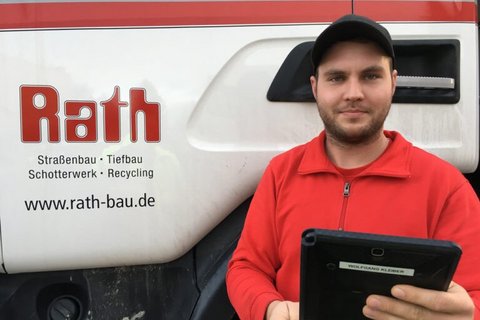 Neben bau-mobil wurde bei der Rath GmbH noch ein weiteres Tool unter die Lupe genommen. Die Entscheidung fiel auf die Software von Connect2Mobile, die durch eine professionellere Optik und eine besonders intuitive Bedienung im Unternehmen überzeugte. Bereits nach weniger als zwei Monaten und nur zwei einführenden Schulungen war die gesamte Belegschaft im Unternehmen, die das System für die täglichen Aufgaben benötigt, durchweg in der Lage, produktiv zu arbeiten. Fast 40 Mitarbeiter auf den Baustellen, das sind Bauleiter, Poliere und LKW-Fahrer, arbeiten mit der bau-mobil-App. „Mit der Einführung der App haben wir die Poliere allesamt mit einem neuen Tablet-PC ausgestattet“, erklärt Geschäftsführer Rath. „Davon waren alle begeistert, nicht nur die jüngeren Semester.“ Denn für alle hat sich damit der Arbeitsaufwand deutlich reduziert. bau-mobil wird bei Rath Bau unternehmensübergreifend eingesetzt. Alle Bauleiter nutzen neben der App die Büroversion der Software. Genauso die Disposition, die die anstehenden Aufgaben für alle Mitarbeiter inklusive der zugeordneten Maschinen und Geräte täglich im bau-mobil-System einpflegt. Das bedeutet, die Poliere und Kraftfahrer können alle am Vormittag ihre konkreten Aufgaben auf dem Display ihres Tablets einsehen und wissen auf einen Blick, was sie zu tun haben. Für LKW-Fahrer besteht sogar die Möglichkeit, sich via App direkt zur Baustelle führen zu lassen. Fahrer Steffen Behlke hat sich sehr schnell mit der neuen App zurechtgefunden, schätzt die Übersichtlichkeit und vor allem den Wegfall vieler handschriftlich zu erledigender Aufgaben.